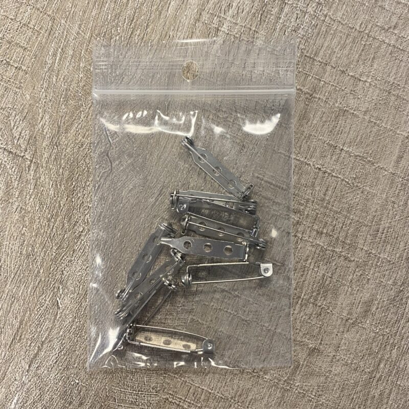 Een zakje met 10 rvs broche bevestigingen om je zelfgemaakte sieraden van acryl of hout mee te bevestigen.