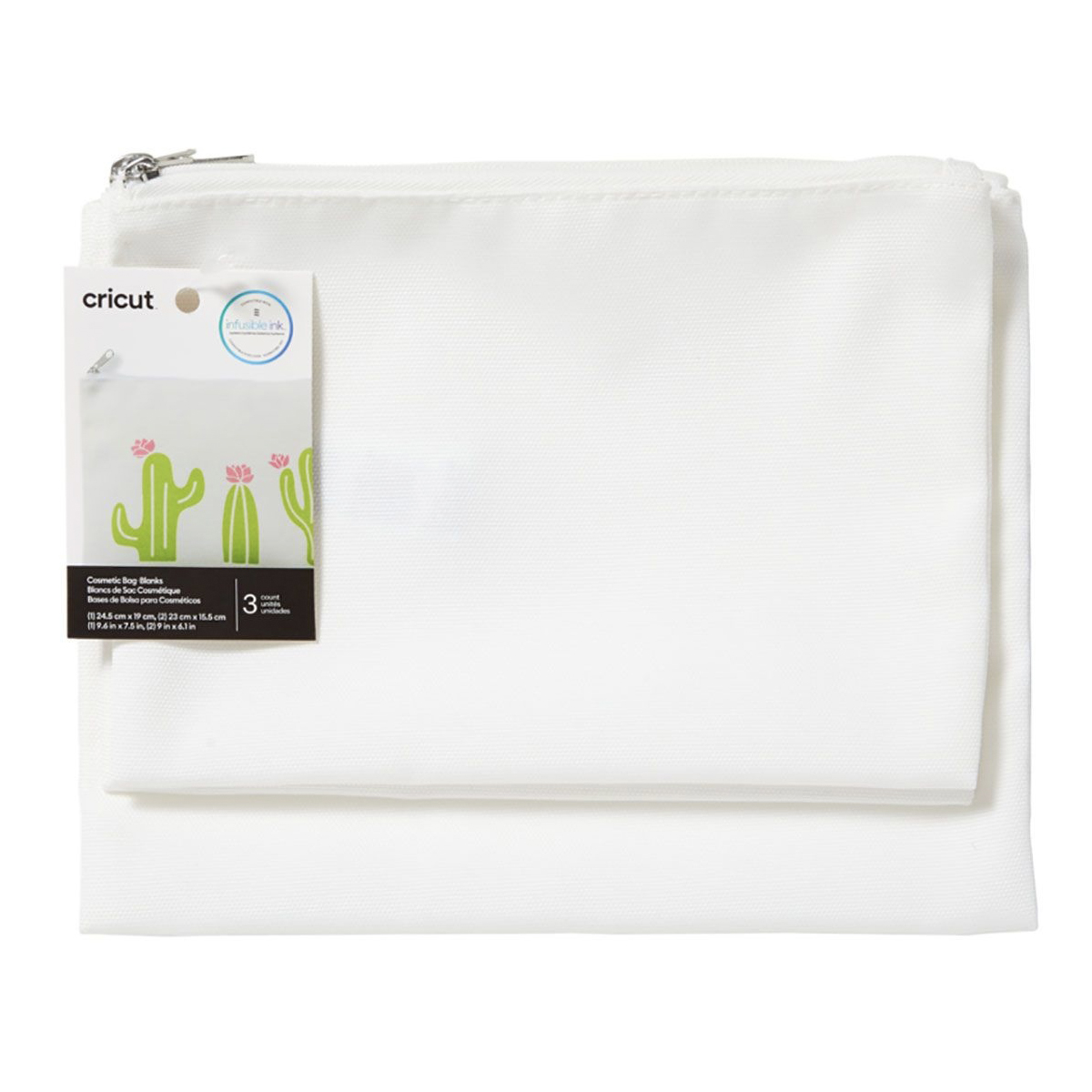 Een set van 3 blanco tasjes, geschikt als make-up tasje en/of toilettas. Deze leuke tasjes zijn eenvoudig te bewerken met de Cricut Infusible Ink. Geschikt voor zowel de Flex als de Pennen en de Markers.
