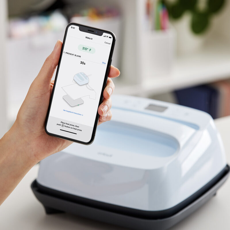 De pers komt met een handige Cricut Heat™-app die via Bluetooth® rechtstreeks verbinding maakt met de Cricut EasyPress 3 om de ideale tijd- en temperatuurinstelling met één tik te verzenden. Van voorverwarmen tot het persen, de Cricut Heat™-app begeleidt je bij elke stap met eenvoudig te volgen aanwijzingen op het scherm.