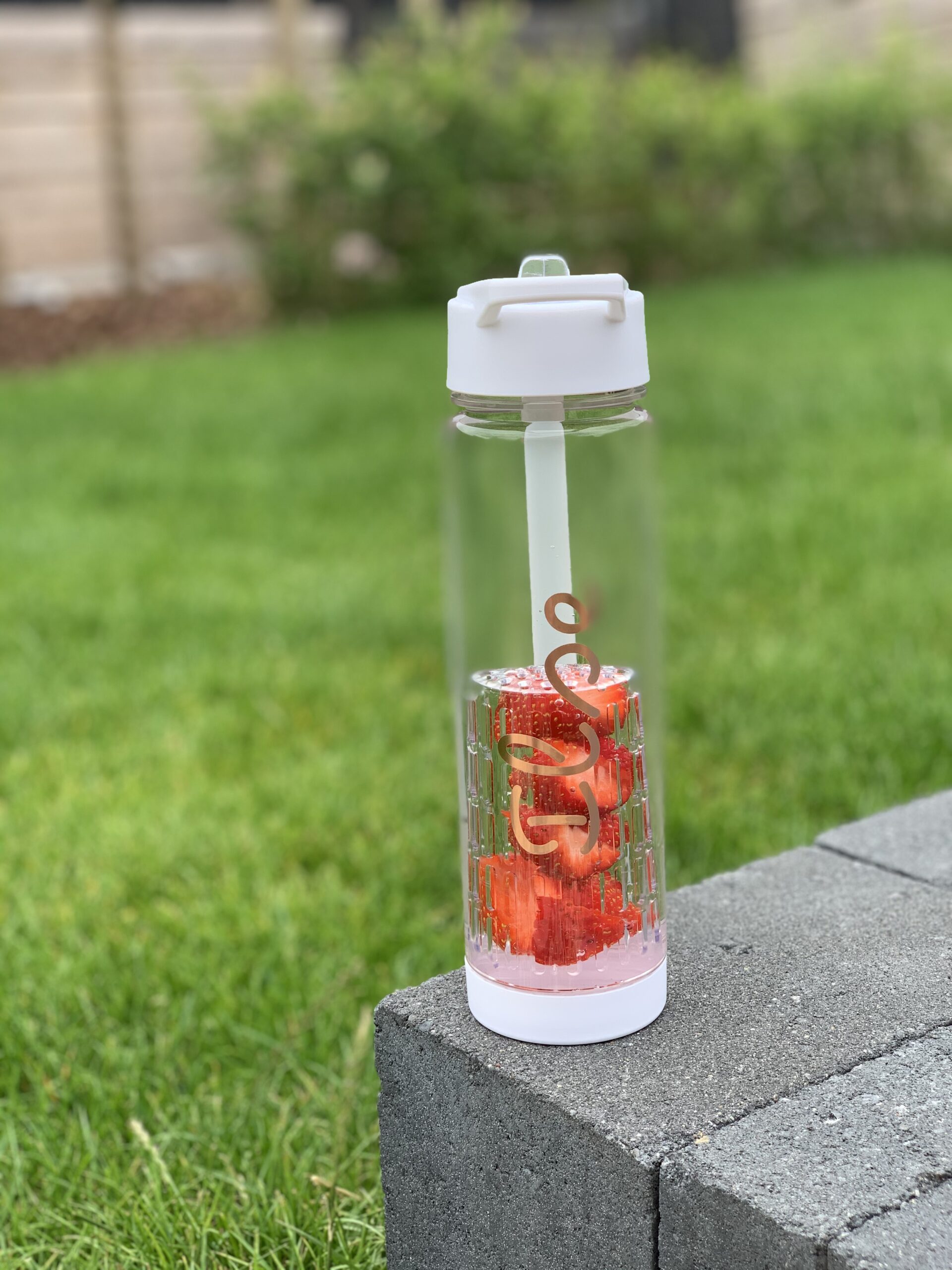 De fles is voorzien van draaidop, fruitfilter en opklapbare drinktuit