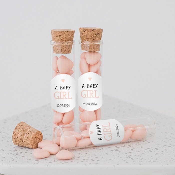 Deze mooie glazen buisjes met kurk-stop zijn ideaal te gebruiken als geboortegeschenk of bruidssuiker.