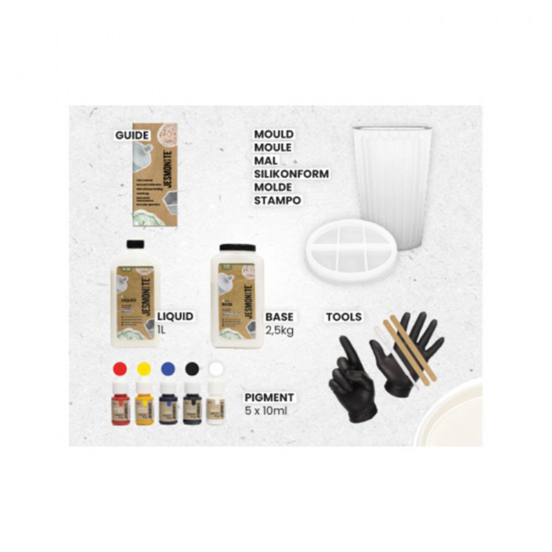 Deze kit bevat alles wat je nodig hebt om met Jesmonite te beginnen, inclusief pigmenten, herbruikbare siliconen vormen en stapsgewijze instructies die je door alle stappen heen leiden.