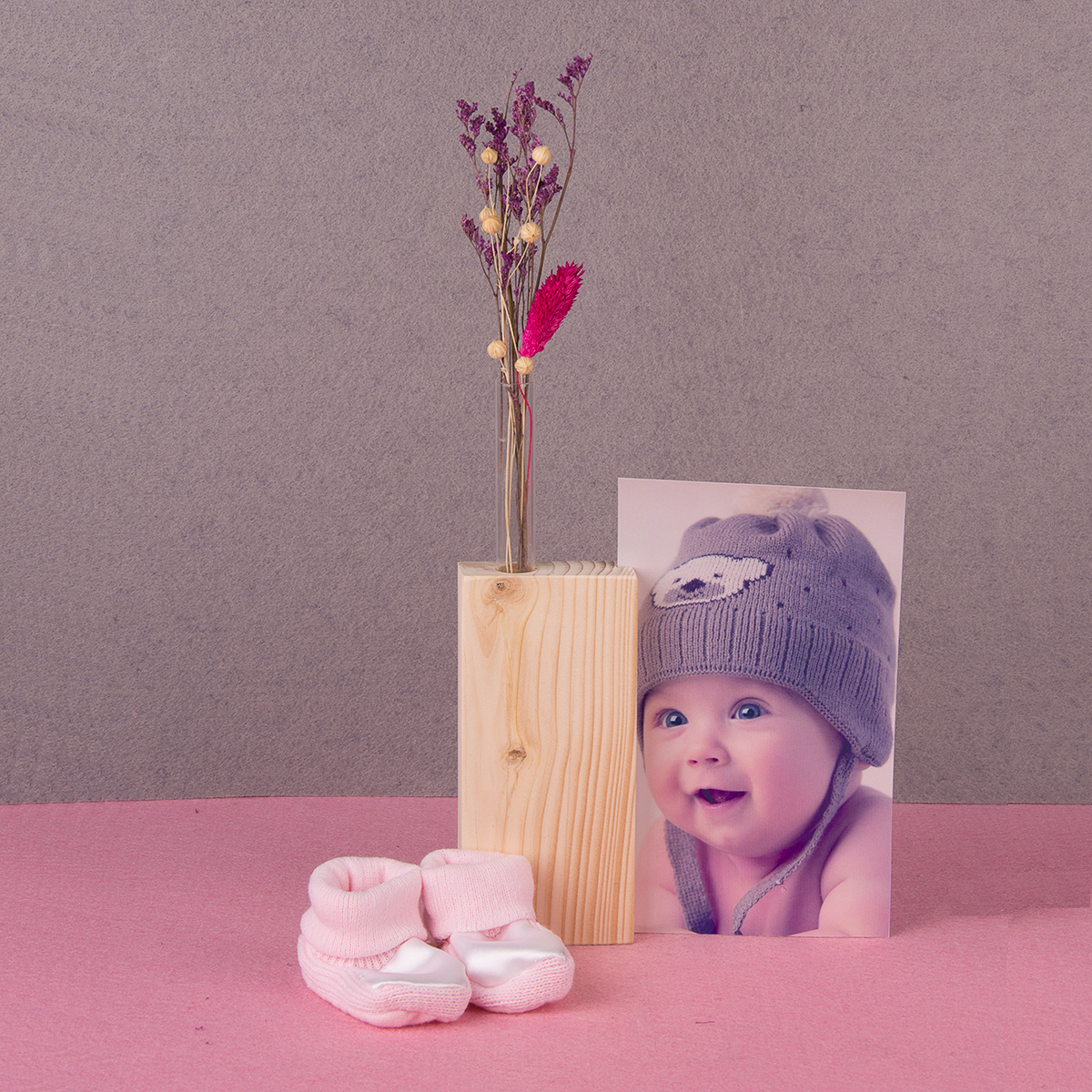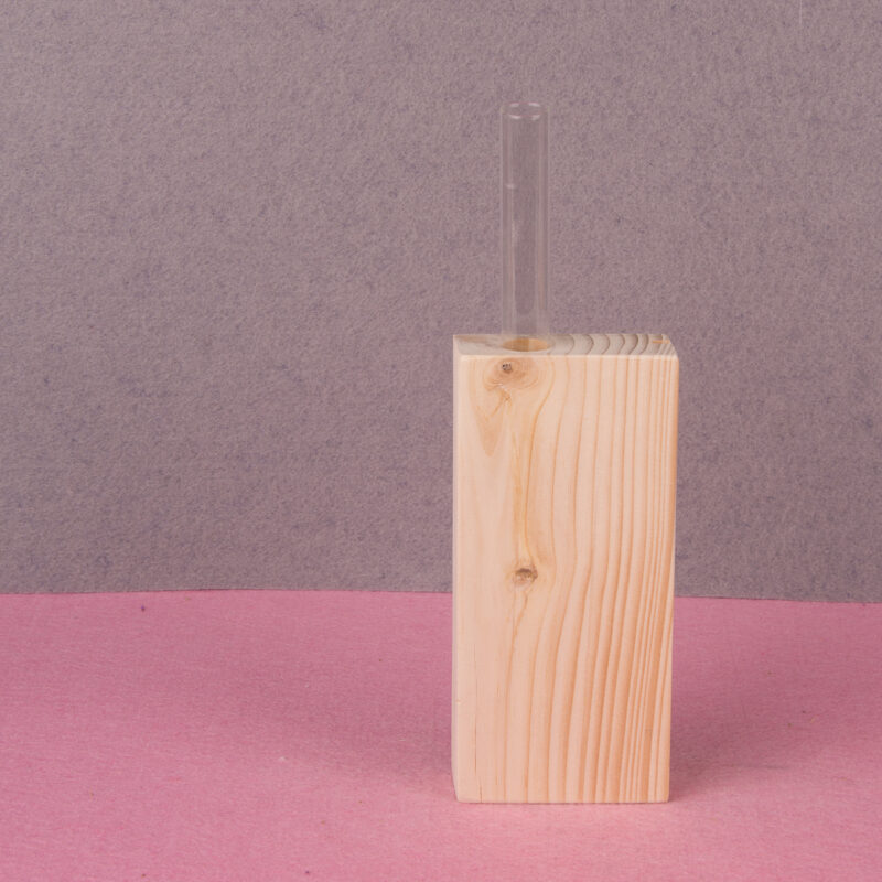 Houten blokje met zaagsnede aan de zijkant voor een foto of kaart. Op het blokje is een buisje van 10 cm geplaatst voor bloemen en/of droogbloemen