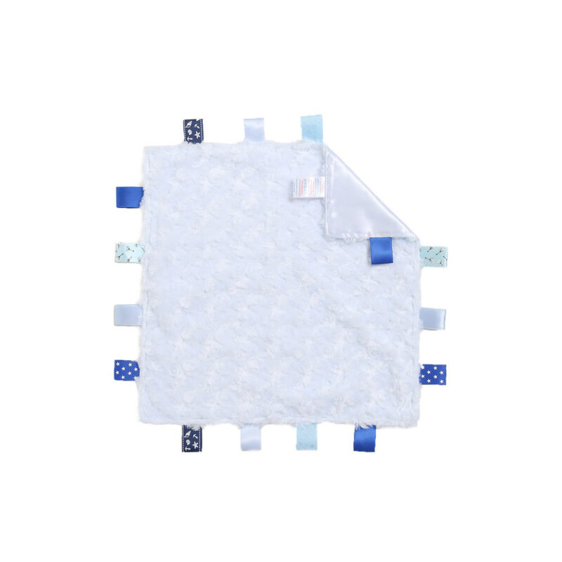 Superzachte en grote knuffeldoek van 35×35 cm, met labeltjes van verschillende stofjes rondom.