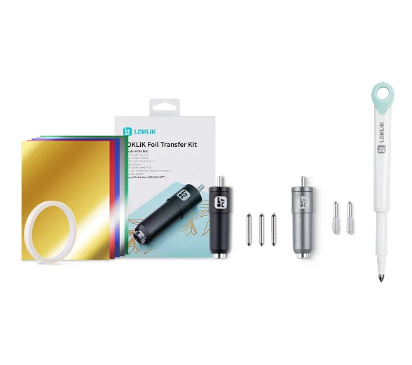 LOKLiK iCraftâ„¢ gereedschap: folietransferset, folievellen, rilnaald en mes met diepe punt.