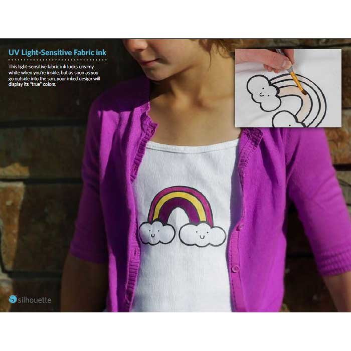 Deze UV Licht Gevoelige textielverf ziet er wit/crème kleurig uit als u binnenshuis bent, maar zodra u naar buiten gaat, ziet u door blootstelling aan licht de “echte” donkerdere kleuren. Geweldig dus voor kinderen en kinderen in hart en nieren!