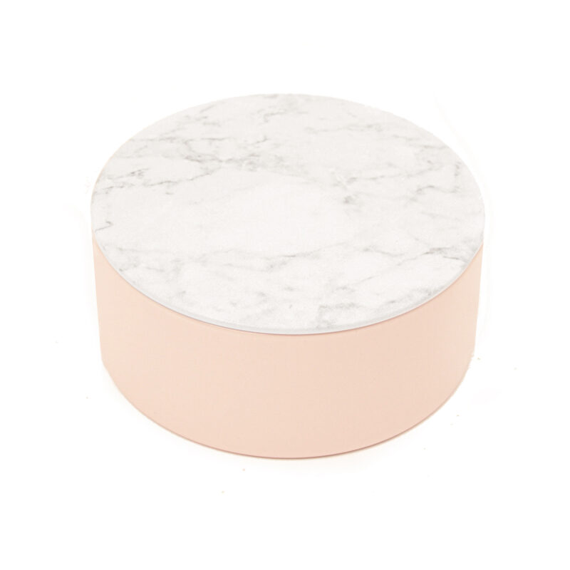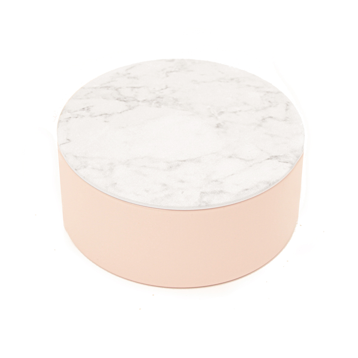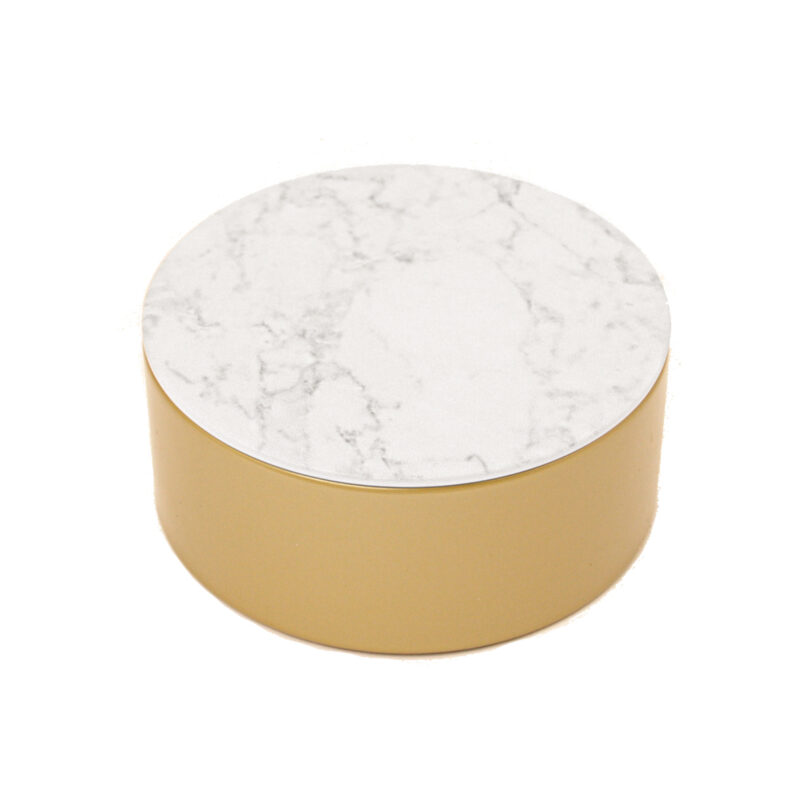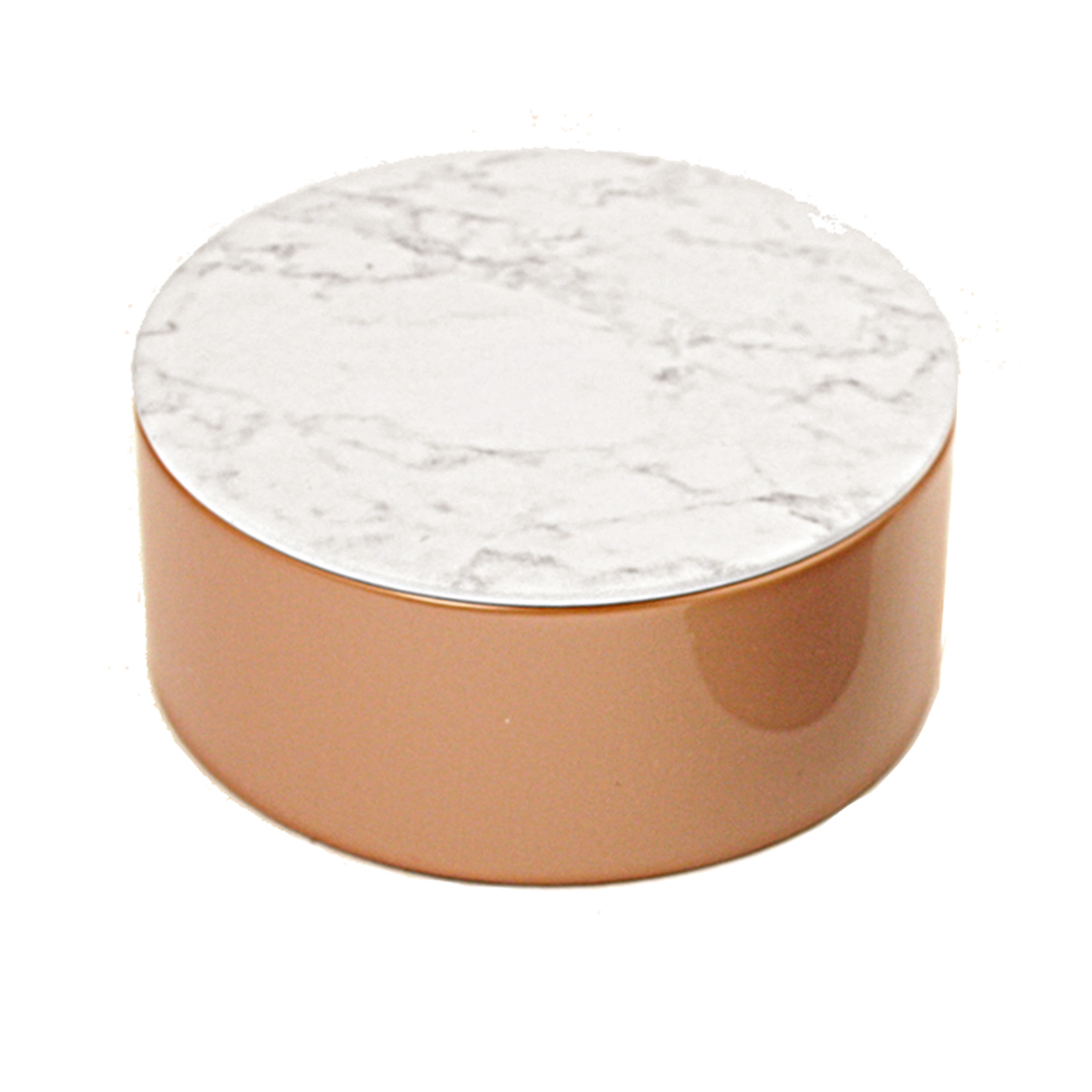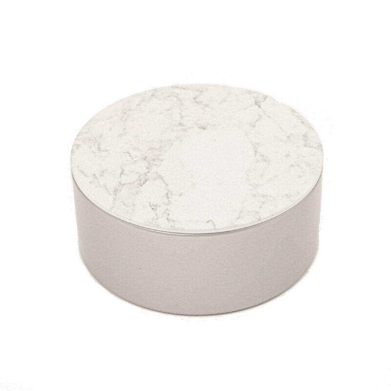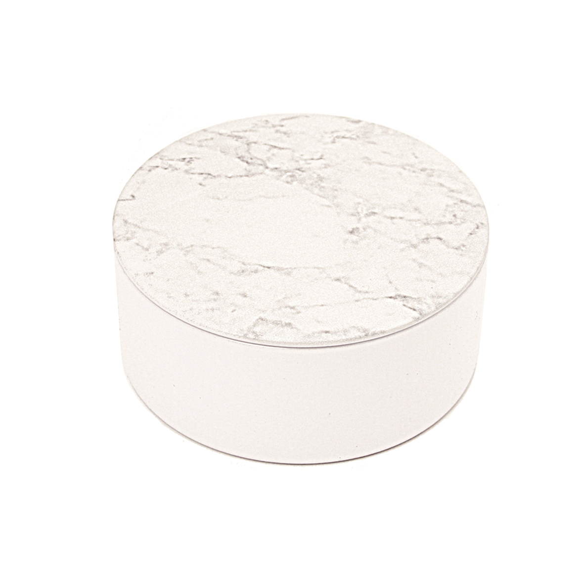 Superleuk blikje om te beplakken met vinyl. Mooi afgewerkt in glanzende kleuren, met een mooi sluitend marmeren deksel.