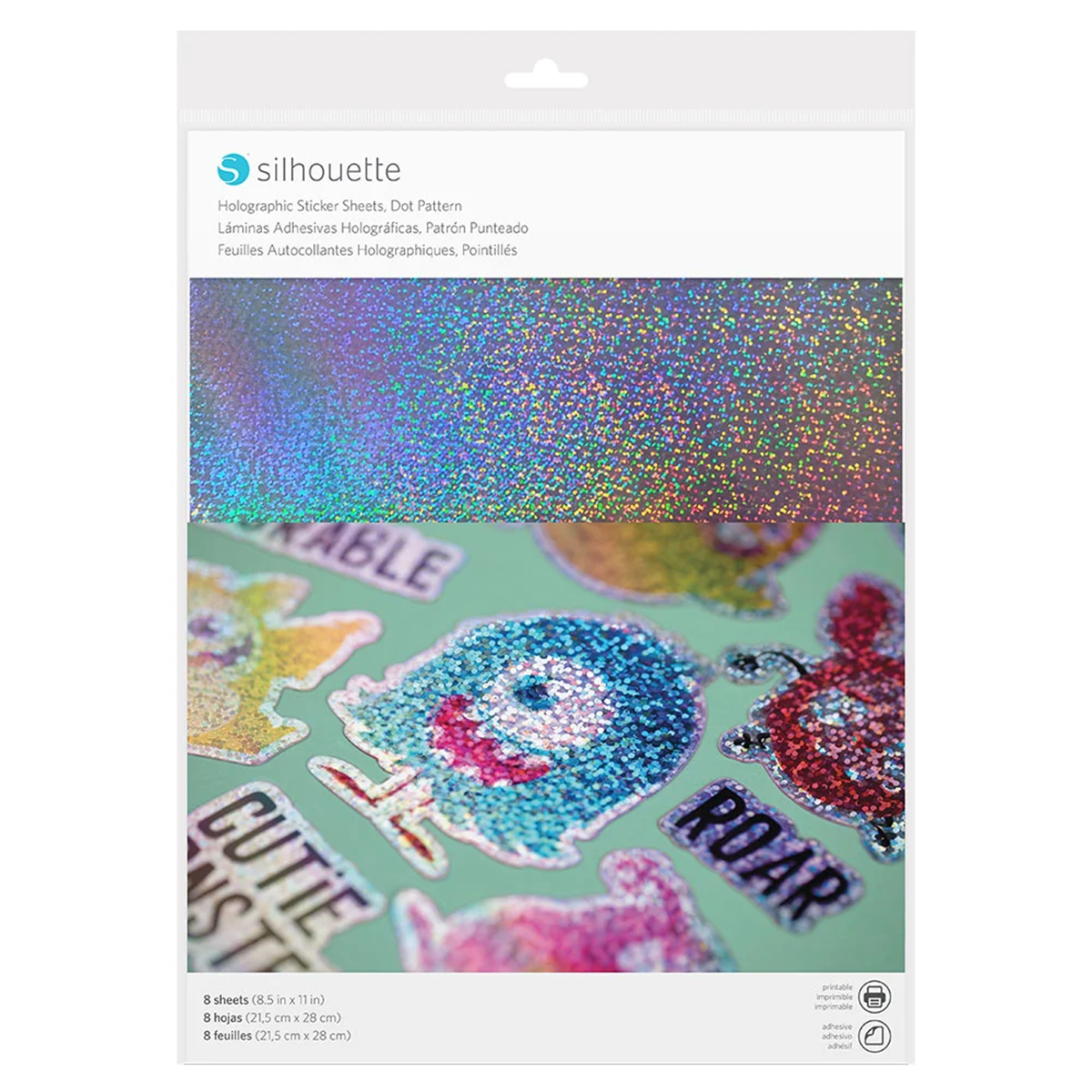 Maak labels en stickers met een unieke uitstraling met behulp van Holographic Dots Sticker Sheets. Dit materiaal heeft een bedrukbaar oppervlak en een zelfklevende achterkant. Het holografische stippeneffect van het stickeroppervlak wordt weergegeven door middel van afgedrukte afbeeldingen.