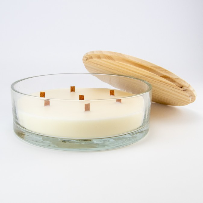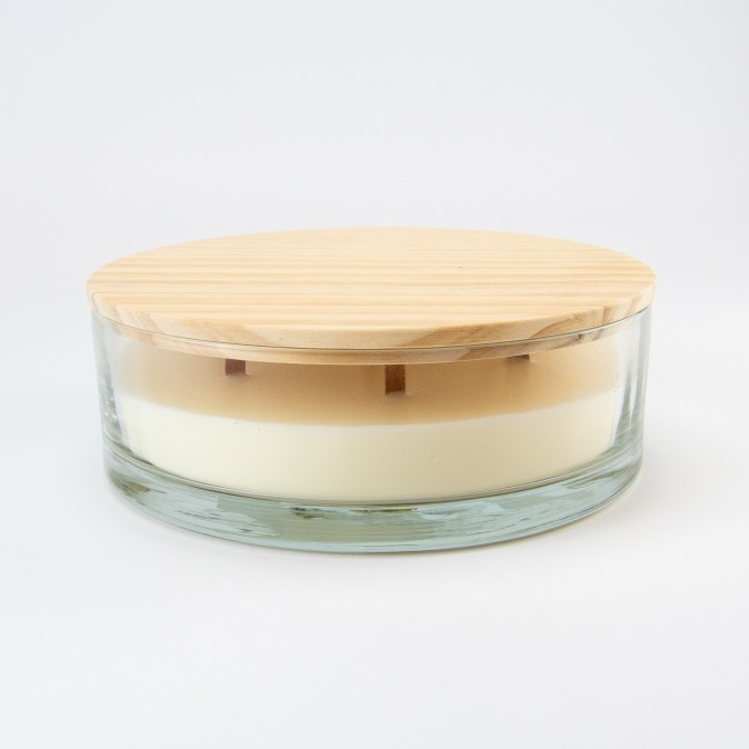 Door de glazen, lage pot met een stevige houten deksel straalt deze kaars een en al luxe uit.