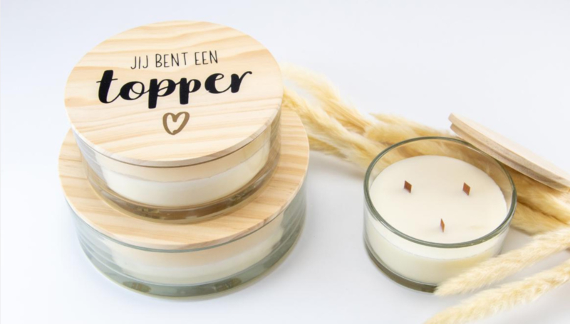 Zowel de glazen pot als de deksel zijn gemakkelijk te personaliseren met bijvoorbeeld vinyl, decal of printbaar stickerfolie, maar wat dacht u van het graveren van de houten deksel middels een van onze lasercutters?