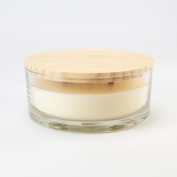 Door de glazen, lage pot met een stevige houten deksel straalt deze kaars een en al luxe uit.