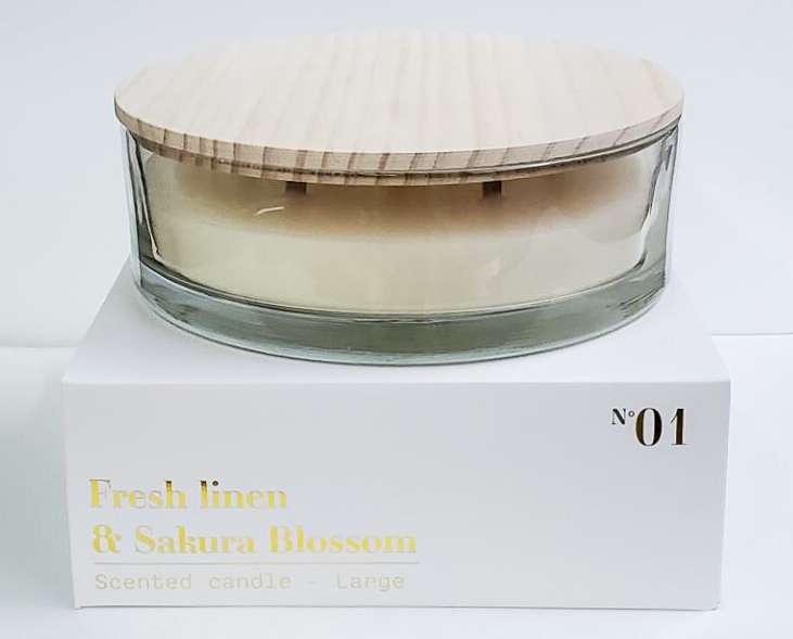 De witte kaars heeft de heerlijke geur van Fresh Linen & Sakura Blossom.
