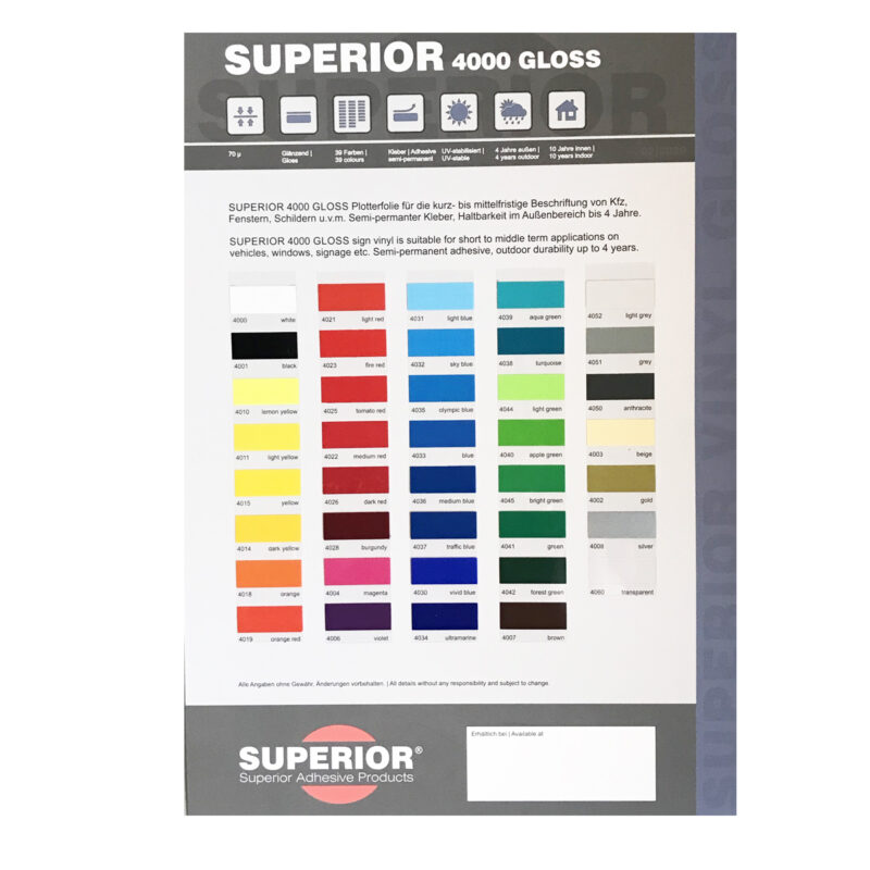 Deze Superior kleurenkaart bevat samples van alle kleuren glans vinyl.